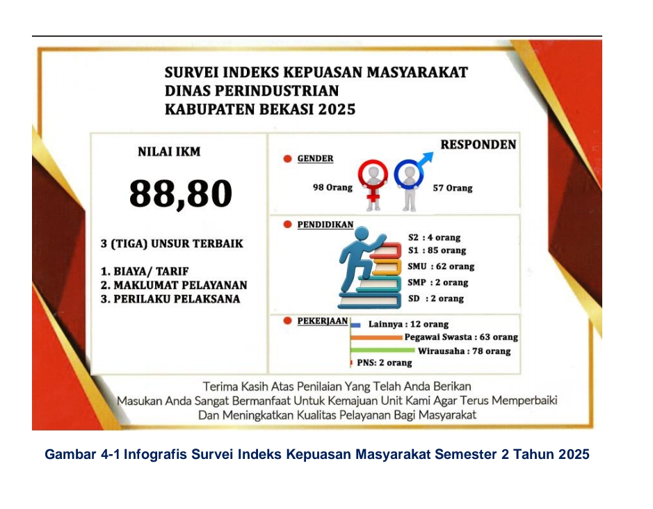 Kepala Dinas Perindustrian menyampaikan bahwa capaian ini merupakan hasil kerja kolektif seluruh jajaran. “Kami berkomitmen terus meningkatkan kualitas layanan. Pencapaian IKM tahun 2025 adalah bukti bahwa perubahan yang kami lakukan berada di jalur yang benar,” ujarnya. Sejumlah aspek yang memperoleh nilai tinggi dalam survei di antaranya responsivitas petugas, kejelasan prosedur, serta kemudahan akses informasi.