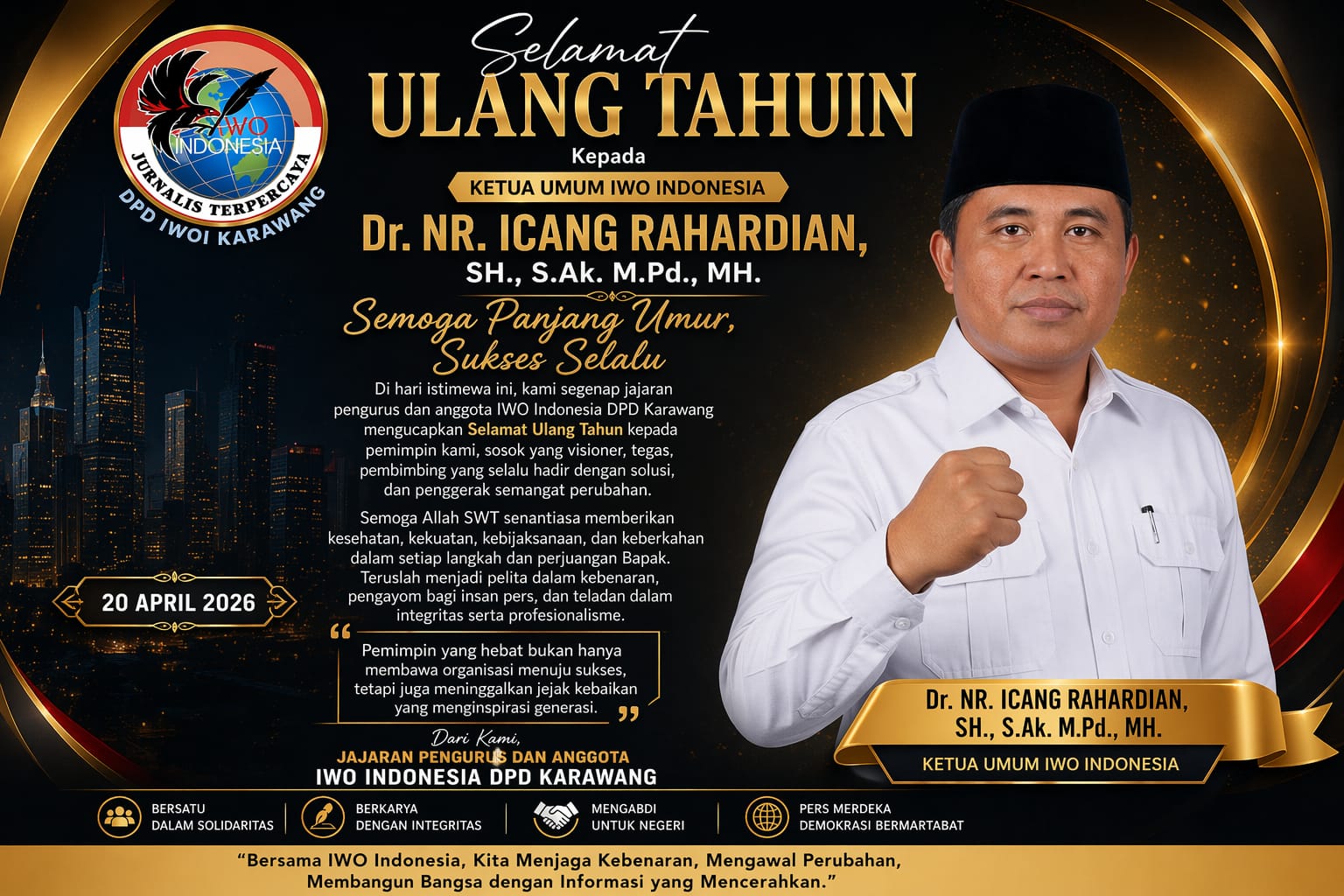 Karawang, | BEKASIHARIINI.COM | – Suasana penuh rasa hormat dan kebanggaan menyelimuti jajaran pengurus serta anggota Ikatan Wartawan Online Indonesia (IWOI) Dewan Pimpinan Daerah (DPD) Kabupaten Karawang dalam momentum peringatan hari ulang tahun Ketua Umum IWO Indonesia, Dr. NR. Icang Rahardian, SH., S.Ak., M.Pd., MH, yang jatuh pada 20 April 2026.