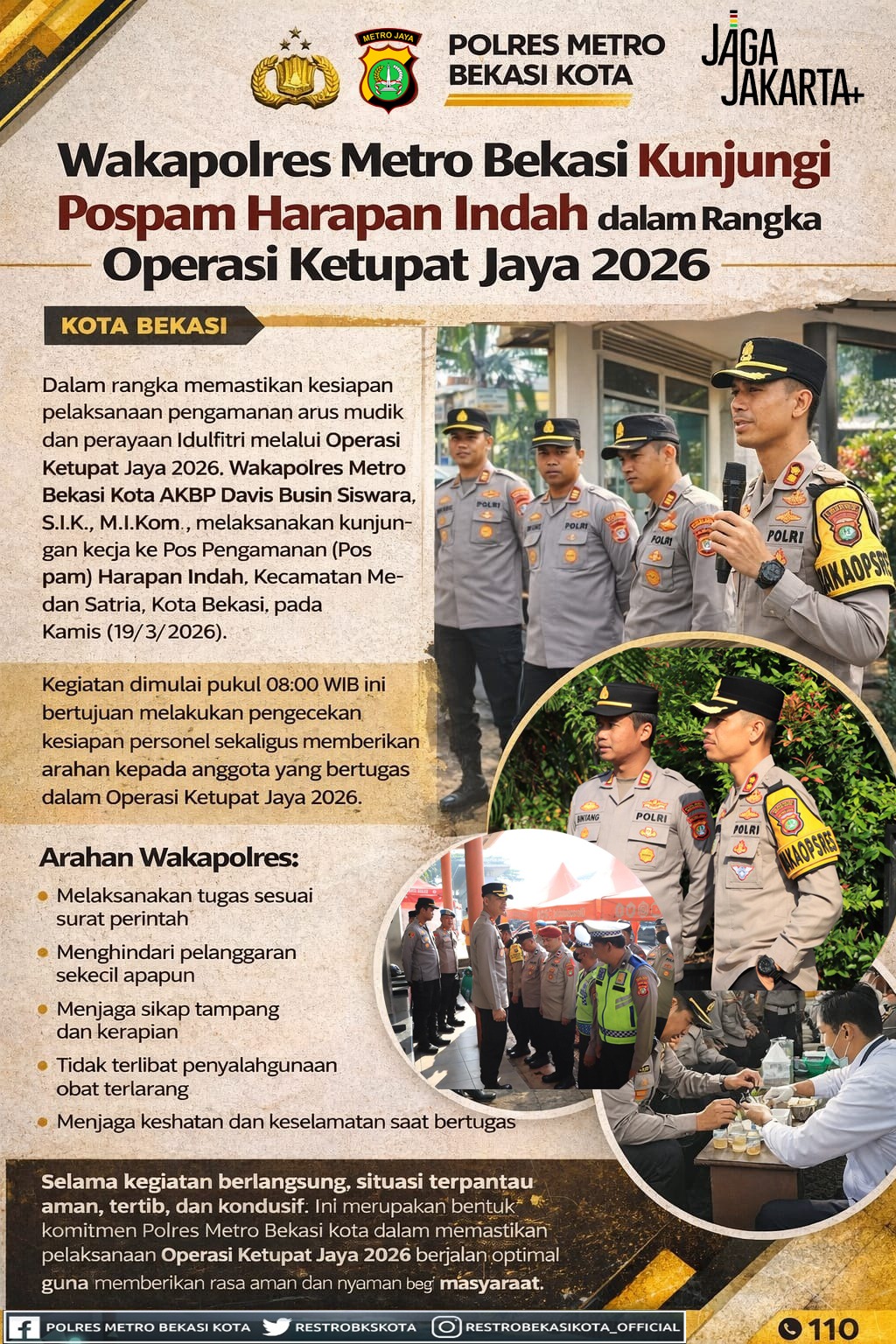 Selama kegiatan berlangsung, situasi terpantau dalam keadaan aman, tertib, dan kondusif. Kegiatan ini merupakan bagian dari komitmen Polres Metro Bekasi Kota dalam memastikan pelaksanaan Operasi Ketupat Jaya 2026 berjalan secara optimal, demi memberikan rasa aman dan nyaman bagi masyarakat selama momentum Hari Raya Idulfitri.