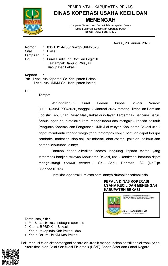 Kegiatan penyaluran bantuan tersebut dihadiri langsung oleh Kepala Dinas Koperasi dan UKM Kabupaten Bekasi, Drs. H. Hasan Basri, MM, beserta jajaran, sebagai bentuk dukungan dan perhatian pemerintah daerah terhadap masyarakat yang terdampak bencana. Minggu (25/01/2026).