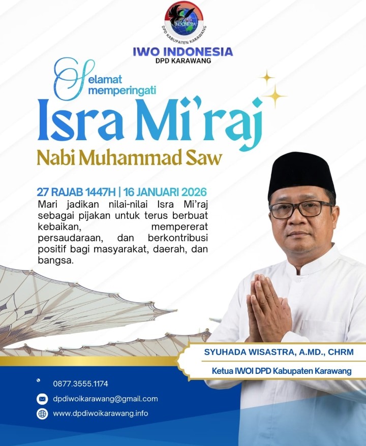 KARAWANG — Dalam rangka memperingati Isra Mi’raj Nabi Muhammad SAW 1447 Hijriah yang jatuh pada Jumat, 16 Januari 2026, Ketua Ikatan Wartawan Online Indonesia (IWO Indonesia) DPD Kabupaten Karawang, Syuhada Wisastra, A.Md., CHRM, menyampaikan ucapan selamat sekaligus pesan moral kepada seluruh insan pers dan masyarakat luas.