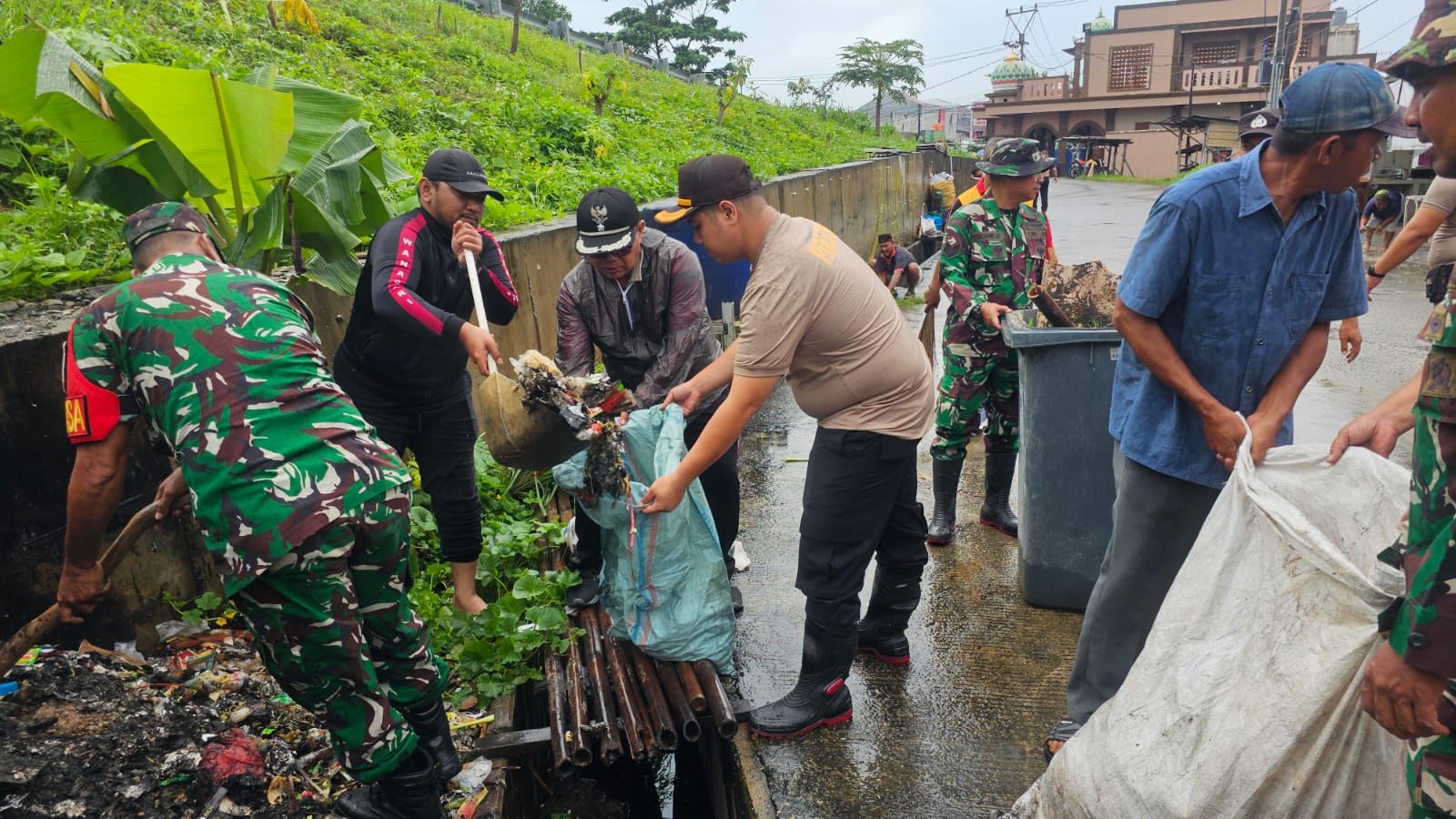 Selanjutnya, pada pukul 08.30 WIB, seluruh personel dan masyarakat bergerak melaksanakan kerja bakti dengan fokus pada pembersihan parit dan saluran air, pengangkutan sampah, serta pemotongan rumput liar di sekitar lokasi kegiatan.